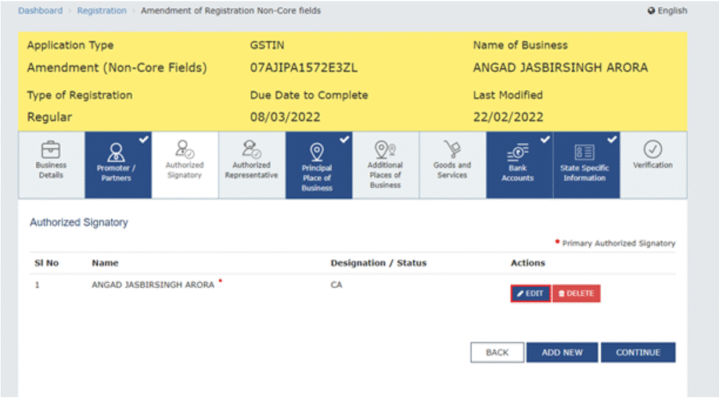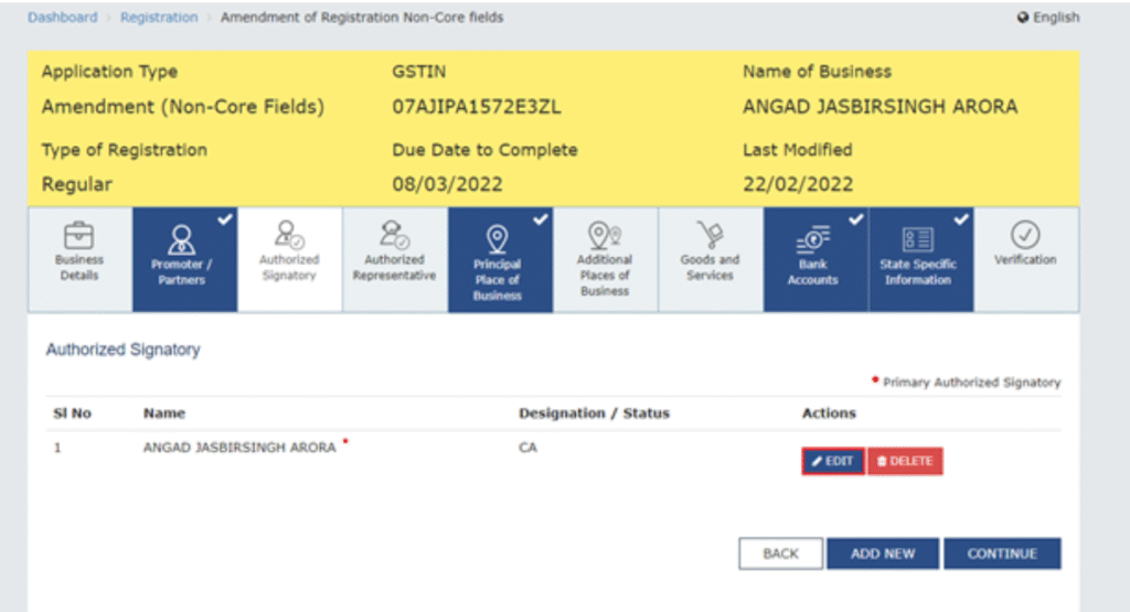 Step 2: Go to the ‘Authorised Signatory’ tab and click on the ‘Add New’ button.