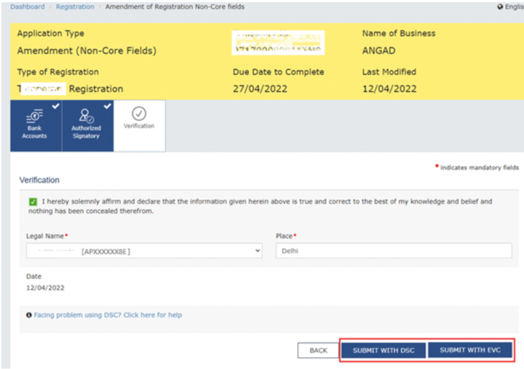Step 5: Go to the ‘Step 5: Go to the ‘Verification’ tab. Fill in the required details, tick the declaration checkbox, and submit the form using DSC, E-signature, or EVC.